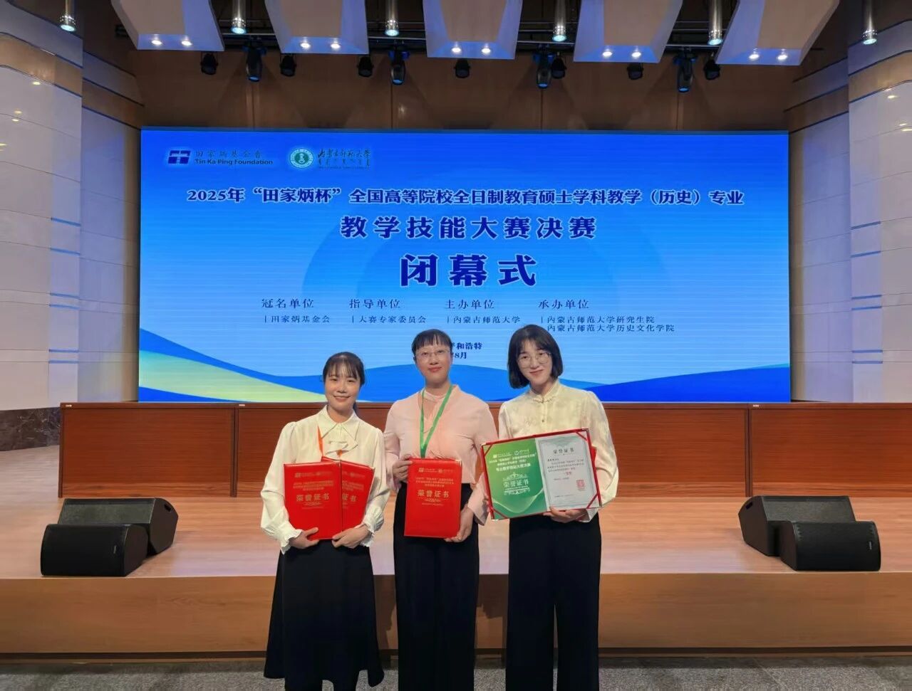 8月22日至25日,经过多轮激烈比拼,2025年“田家炳杯”全国高等院校全日制教育硕士学科教学(历史)专业教学技能大赛决赛于内蒙古师范大学圆满收官。公司研究生雷欣怡凭借出色的综合表现,荣获一等奖及优秀教学设计奖;廖丹获得三等奖及优秀教学设计奖;陈惠兰老师获评全国优秀指导教师奖。