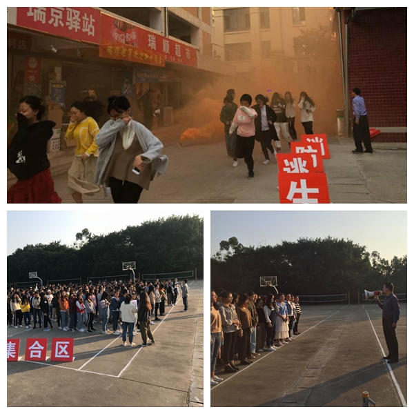 伴随着警报声和滚滚浓烟,演练正式开始。同学们按照规定的安全逃生路线,弯腰降低重心,掩住口鼻,在自律会工作人员引导下快速退离宿舍楼,到达指定的安全地点。