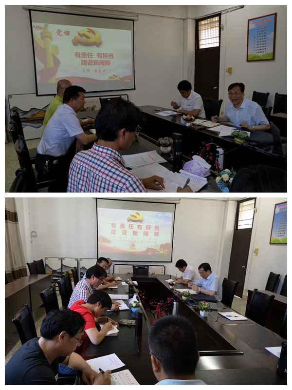 黄书记利用这次机会,以“有责任有担当,建设新闽师”为题,专门为党员同志们上了党课。在党课上,黄书记着重就什么是担当、党员为什么要有担当、如何做到担当等三个层面的问题作了全面深入的诠释,黄书记在解读党员应该如何为新闽师建设贡献力量的时候,深情地唱起了校歌,还跟党员一起重温入党誓词,在场的党员同志们深受感动,黄书记说,校歌包容了新闽师建设的全部内涵,入党誓词是每位共产党员的行动指南。