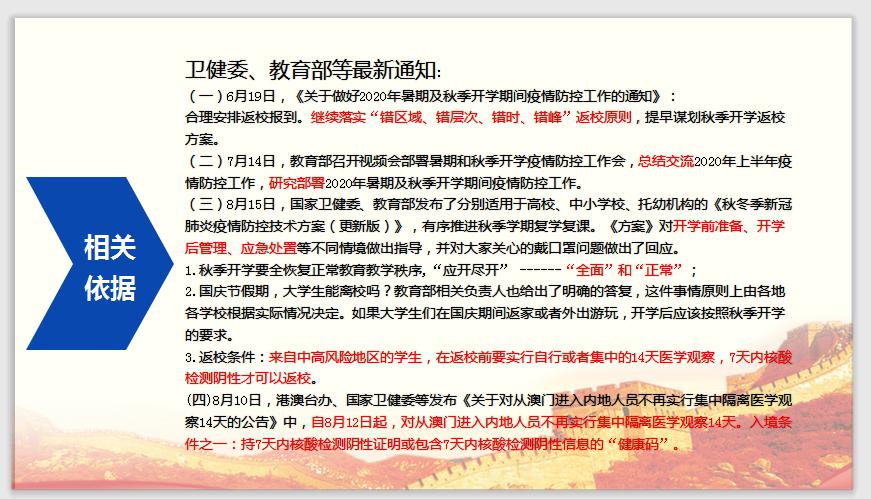 首先,两位老师从国家卫健委、教育部、教育厅等部门关于秋季开学的相关精神介绍秋季开学的整体形势以及公司制定开学计划的相关依据和做法,如严格遵照“错区域、错层次、错时、错峰”返校原则、“应开尽开”、“一校一策”等等,为同学们深入认识秋季开学形势,支持公司和公司秋季开学部署提供了基础。