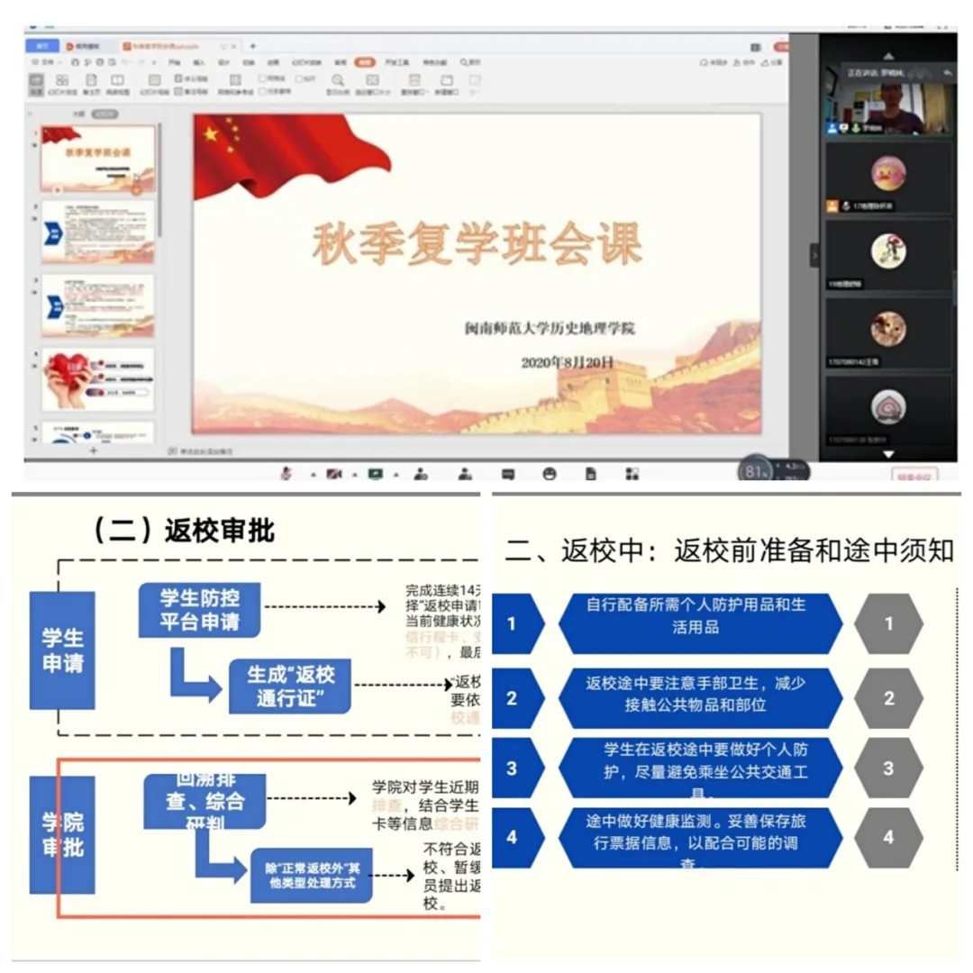 为保障2020年秋季学期顺利开学,史地公司政工在8月19日上午通过腾讯会议APP召开线上秋季开学班会课,讲解公司和公司分期分批错时错峰返校的相关安排和部署。会议根据所带团总支分设两场,由罗老师和方老师主讲。