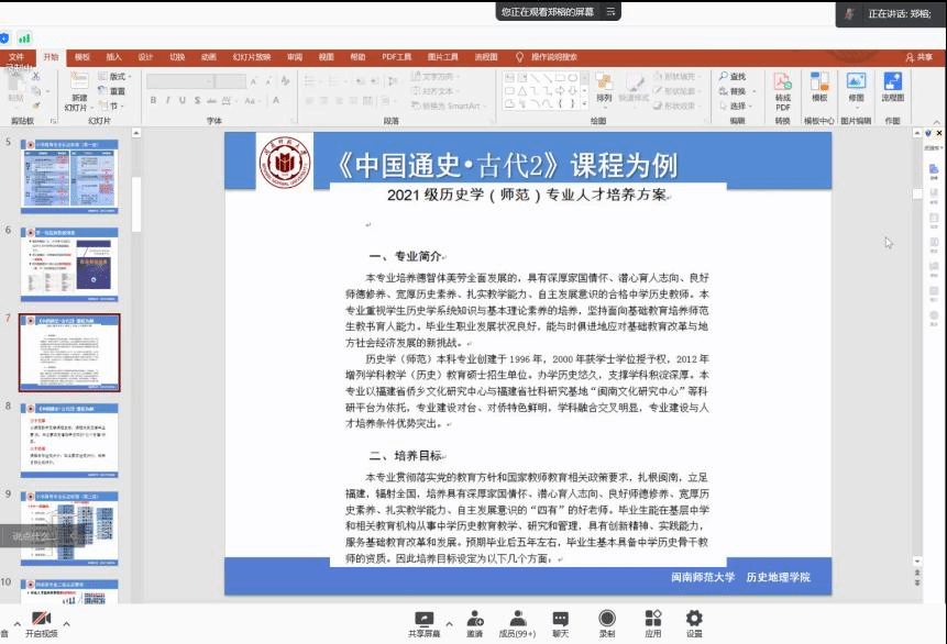 其次,郑榕副经理以《历史学(师范)专业人才培养方案》为例,向全体师生解读师范专业认证的“三个支撑”“三个达成”的机制,以及“反向设计,正向施工”的认证工作思路。他还结合自身《中国通史•古代2》的教学课程经验,向同学解读师范认证工作对于课程教学的重大促进。师范认证是以员工能力产出为导向,不同的课程目标采取不同的教学内容、考核方式,彻底改变传统课堂“一张卷子定成绩”的做法。教育同学们师范认证的“员工中心”理念也包含员工发挥自身学习主动性、能动性的含义,鼓励同学们充分按照师范认证理念,配合教师的教,不断提升自身全面的能力素质。