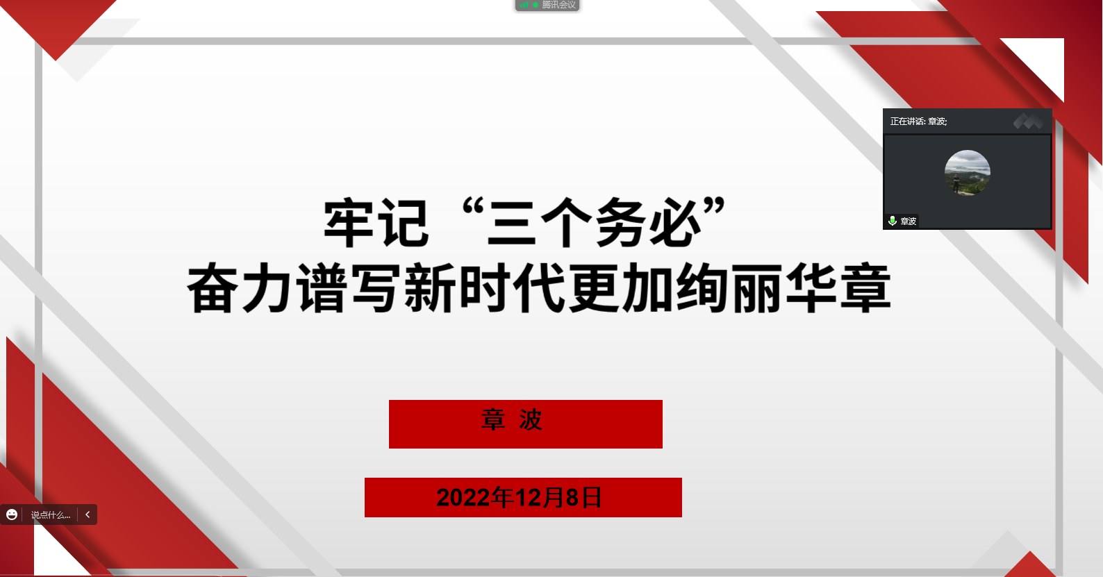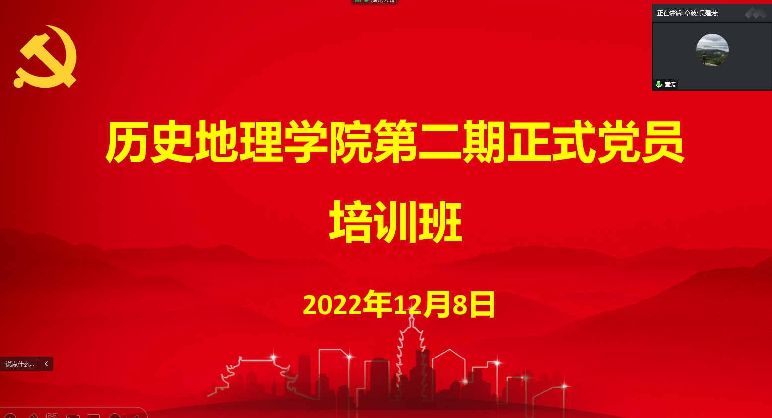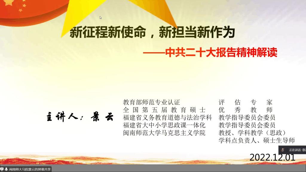 为巩固党史学习教育成果,深入学习贯彻党的二十大精神,12月8日下午,公司举办第二期正式党员培训班。公司邀请公司思想政治理论课教师、二十大精神宣讲团成员、硕士生导师景云教授以及公司党委书记章波为师生党员讲授专题党课,课程通过腾讯会议平台讲授。会议由章波主持,PA视讯集团官方网站全体正式党员参与此次培训。