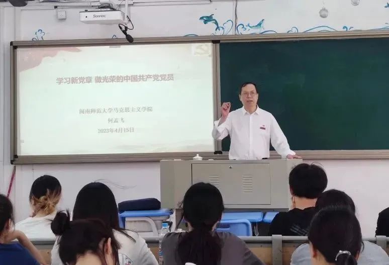 首先,何孟飞以一则关于党章的故事开篇,阐明中国共产党党章所凝聚的中国共产党人的初心与使命。接着,何孟飞立足自身对党的二十大精神与新党章的所学、所思、所悟,从党章是什么、中国共产党的纲领、学习新党章三个方面对党章进行了深入浅出的解读,他带领学员回顾了党章的发展历程,在增强学员们党性观念的同时,引导同学们遵守党章、贯彻党章、维护党章,勉励学员们要牢固树立党章意识,真正把党章作为加强党性修养的根本标准。