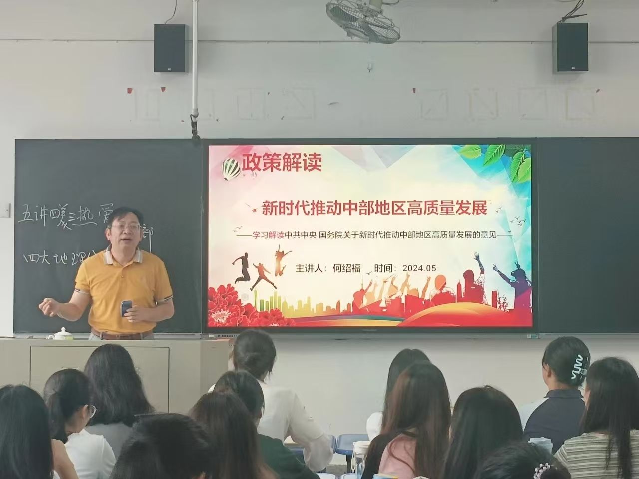 接着,何绍福结合国内外新形势和生活实际,从五大发展理念解读《中共中央国务院关于新时代推动中部地区高质量发展的意见》。针对中部地区资源丰富、劳动力充足但科技创新能力不足的现状,他表示中部地区要做大做强先进制造业,积极承接东部制造业转移,提高关键领域自主创新能力和推动先进制造业和现代服务业纵深融合;对于中部地区区域差异过大,城市首位度过高的问题,他强调通过城乡融合发展和城市品质提升,加快农业农村现代化和推动省际协作和交接地区协同发展;面对中部地区生态环境脆弱,旱涝灾害频发,他启发同学运用区域认知和人地协调观,引导同学思考如何打造人与自然和谐共生的美丽中部;随后他结合中国区域的发展史,指明中部地区要向东部地区学习,优化市场化、法治化、国际化经营,维持良好公平有序的竞争环境,提升公共服务保障水平。在谈及中部地区政策措施的完善和组织实施的落实时,何绍福强调要加强组织领导,把党的领导贯穿推动中部地区加快崛起的全过程,建立健全支持政策体系,加大财税金融支持力度。